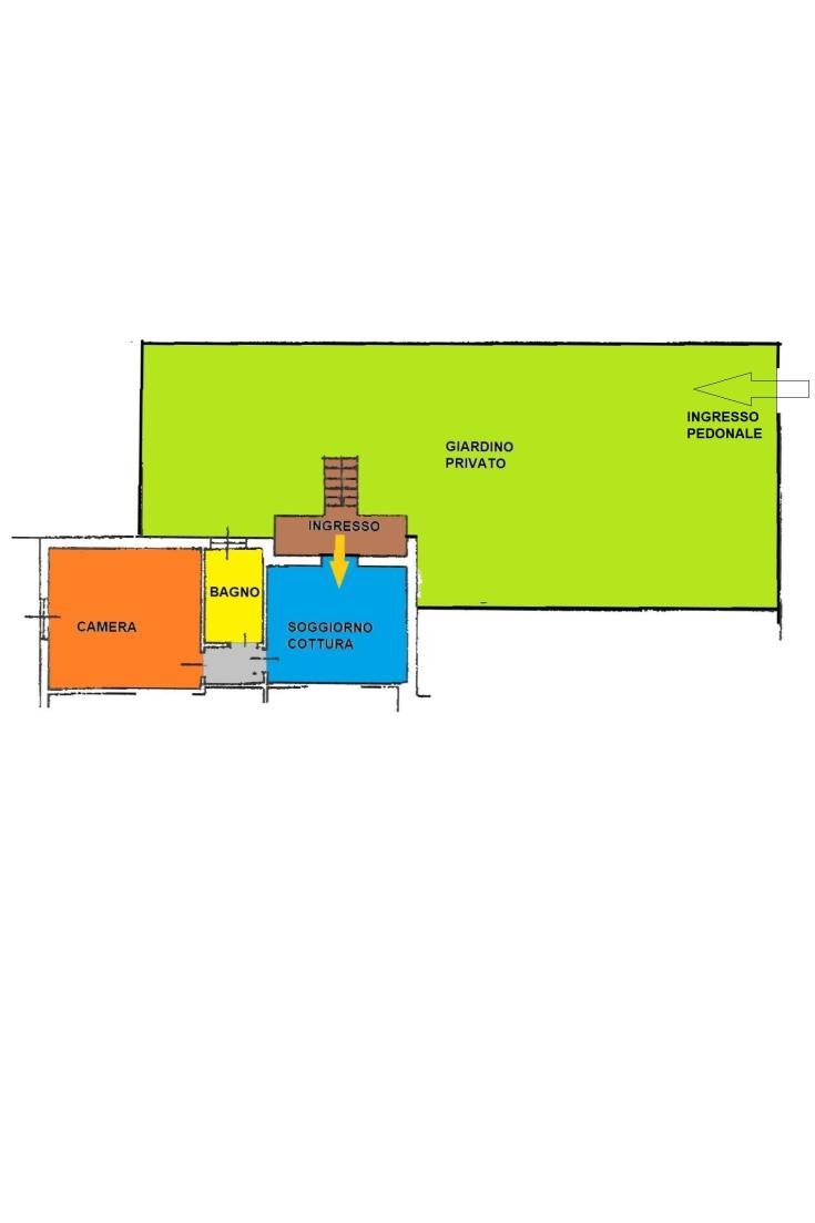 L'appartamento è suddiviso tra la zona giorno con angolo cottura, il disbrigo, la camera matrimoniale e il bagno.